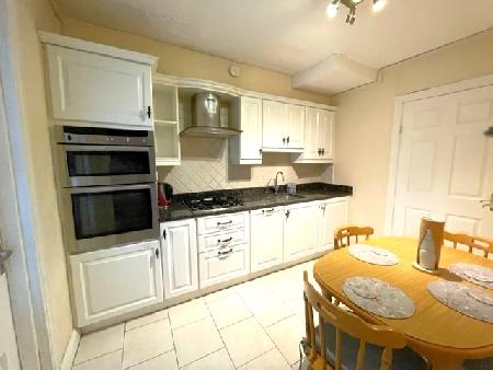 10ft.9 x 8ft.3 Modern fitted kitchen with floor and eye level units, granite work top, built-in electric oven and grill, built-in gas hob, extractor hood, stainless steel sink with water purifier, built-in half dishwasher, radiator, 5 power points, 4 spotlights and tiled floor.